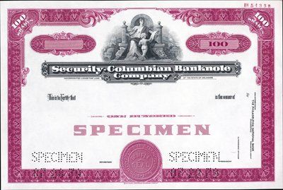 1979. 100 Shs. Proof stock certificate. Pin punch "Specimen - 07-20-79". Red border. Choice uncirculated. Rare border. SCBNC.
