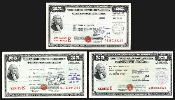 Washington, D.C., Lot of 3 U.S. Savings bonds, all are issued and cancelled $25 bonds, Includes 1945 War Savings Bond Series E issued in both issued at the Army War Bond Office, Morgenthau Jr., Signature; 1949 Series E with Snyder signature and 1954 Series E with Humphrey signature, both issued in Texas. All are in XF to AU condition, one with paper clip rust on bottom middle, All with Washington portrait on left, black on light green. BEP.