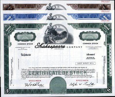 100 Shs. 3 different stock specimens. Vignette with allegorical man standing by running stream. 100 shares, brown. Famous fishing rod, reel and tackle company. Rare fishing and fly fishing related certificates. SCBNC.
