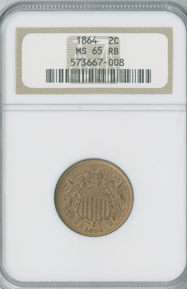 U.S., Shield 2c 1864, Large Motto copper, NGC graded MS65RB, Slab# 573667-008
