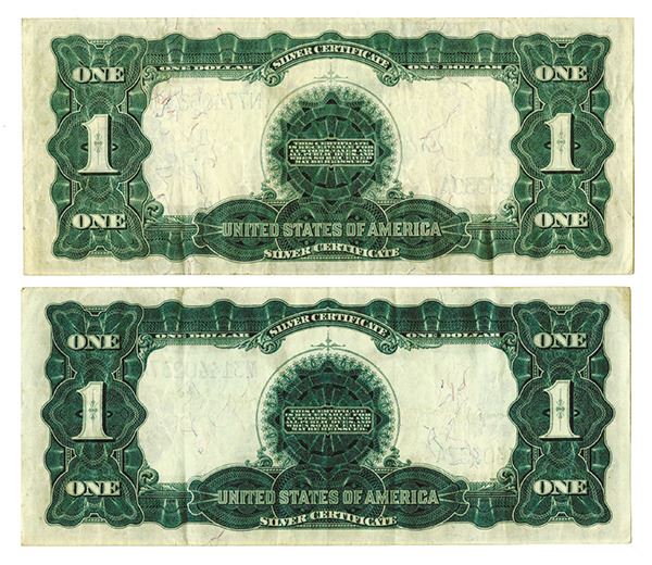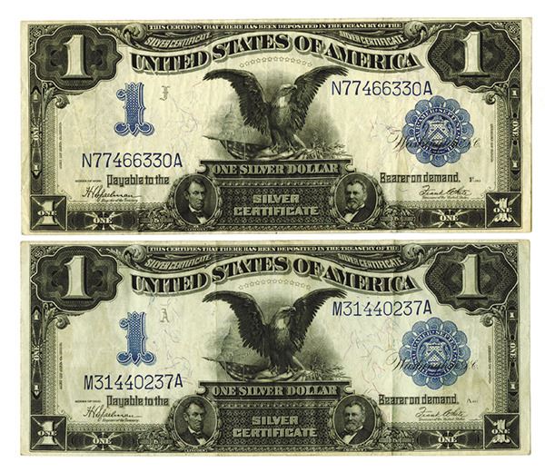 Lot of 2 notes, both are U.S. Silver Certificate, $1, Series of 1899, Black Eagle, Both are VF to Choice VF, bright colors, sharp corners and large even margins.