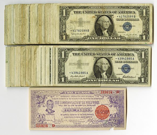 Large group of small size silver certificate $1 note, mostly 1957, with about 20 from 1935. Generally Fine to Very Fine. A couple of star notes. Also included a Commonwealth of the Philippines 1942 issue 2 Pesos bearer demand note in XF condition apart from a missing piece at the bottom. Please inspect. $80 Face.