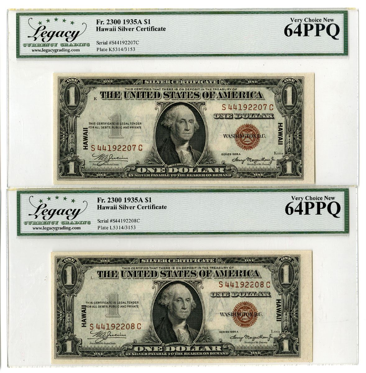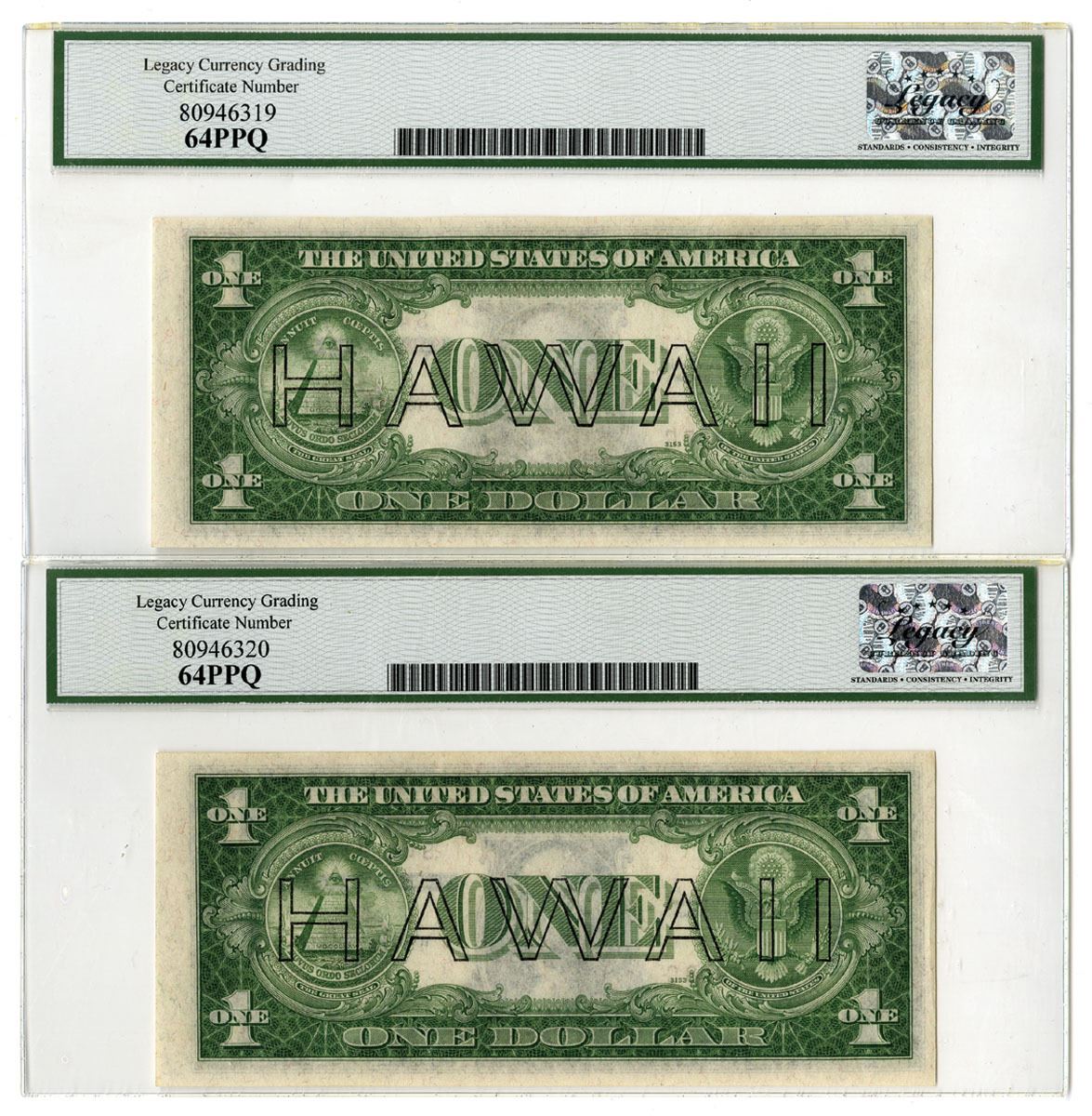 Lot of 2 sequential notes, both Legacy graded, Hawaii. (Washington, D.C.), $1, Fr.#2300 (SC Block), Julian | Morgenthau Sigs, S/N S44192207C - S44192208C pp K & L, Both are Legacy graded Very Choice New 64 PPQ (2)