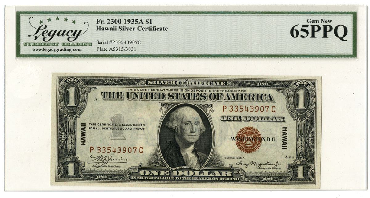 Hawaii. (Washington, D.C.), $1, Fr.#2300 (SC Block), Julian | Morgenthau Signatures, Brown seal at right, Hawaii overprint on back, S/N P33543907C pp A5315/3031, Legacy graded Gem New 65 PPQ.