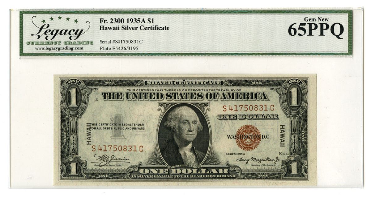Hawaii. (Washington, D.C.), $1, Fr.#2300 (SC Block), Julian | Morgenthau Signatures, Brown seal at right, Hawaii overprint on back, S/N S41750831C pp E5426/3195, Legacy graded Gem New 65 PPQ.