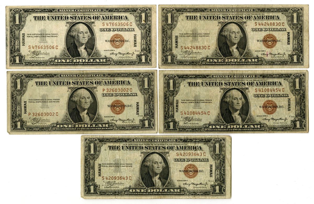 Washington, D.C., Lot of 5 notes, all are Series 1935A. $1, Fr.# 2300 (5), Issued Banknotes, Black print with brown seal at right and 'Hawaii' printed at left and right sides and back Julian | Morgenthau Signatures, Hawaii overprint on back, Notes range from Choice Fine to VF condition. (5). Sold "AS IS" no returns accepted.