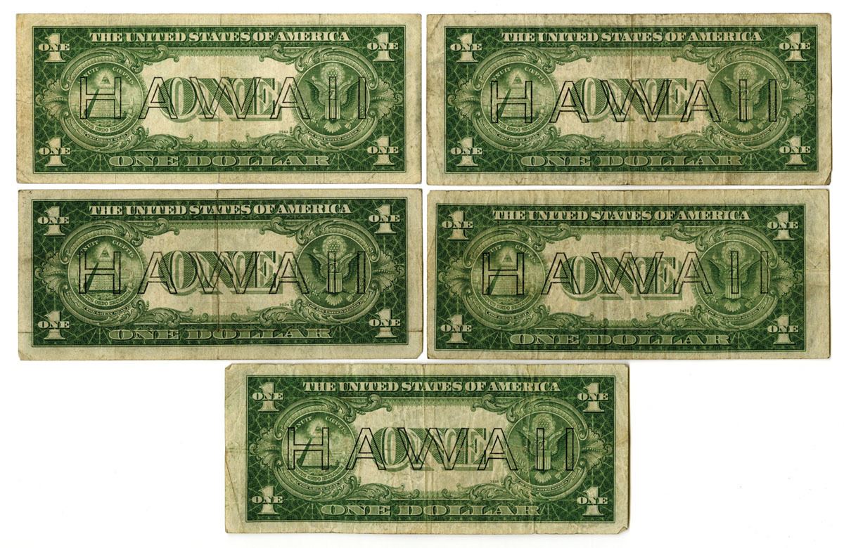 Washington, D.C., Lot of 5 notes, all are Series 1935A. $1, Fr.# 2300 (5), Issued Banknotes, Black print with brown seal at right and 'Hawaii' printed at left and right sides and back Julian | Morgenthau Signatures, Hawaii overprint on back, Notes range from Choice Fine to VF condition. (5). Sold "AS IS" no returns accepted.