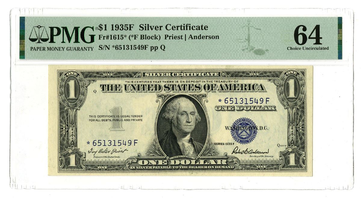 Washington D.C., 1935. $1, Series of 1935F, Fr.# 1615*, *F Block, Star Note, Issued Silver Certificate, Blue seal at right, Priest | Anderson signatures, S/N *65131549F pp Q, PMG graded Choice Uncirculated 64.