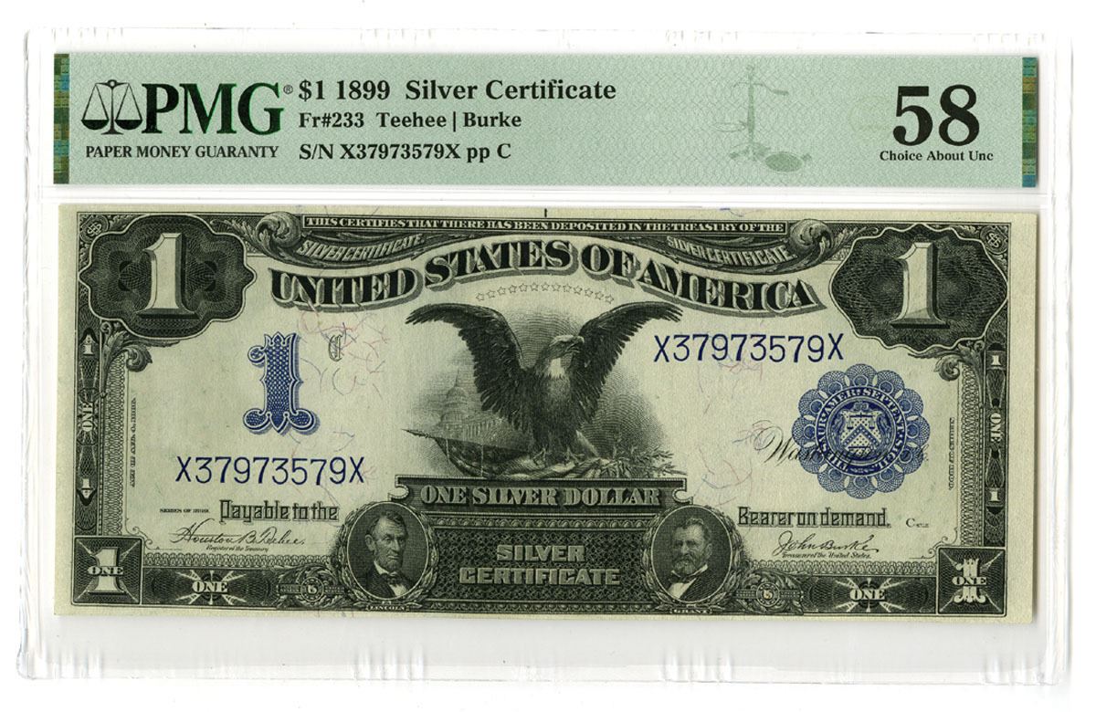 Washington D.C., Series of 1899. $1, P-338b Fr.#233, Issued Silver Certificate, Black and blue printing with eagle and flag over portrait of Abraham Lincoln and Ulysses S. Grant at bottom, Blue scalloped seal at right, Back is green, S/N X37973579X pp C, PMG graded Choice About Uncirculated 58. A very attractive note with 3 large margins and the bottom ample, but slightly close, with sharp corners giving the appearance of a Choice Unc. note at first glance, a superior example for the grade.