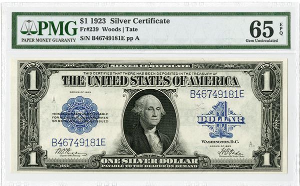 Washington, D.C., $1, Woods | Tate, PMG graded Gem Uncirculated 65 EPQ.