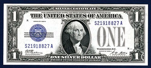 U.S., $1 Silver Certificate, Series of 1928 A, Issued banknote, Woods | Mellon signatures, S21918827A, Choice+ to Gem Uncirculated condition, attractive note with large even margins, pp K.