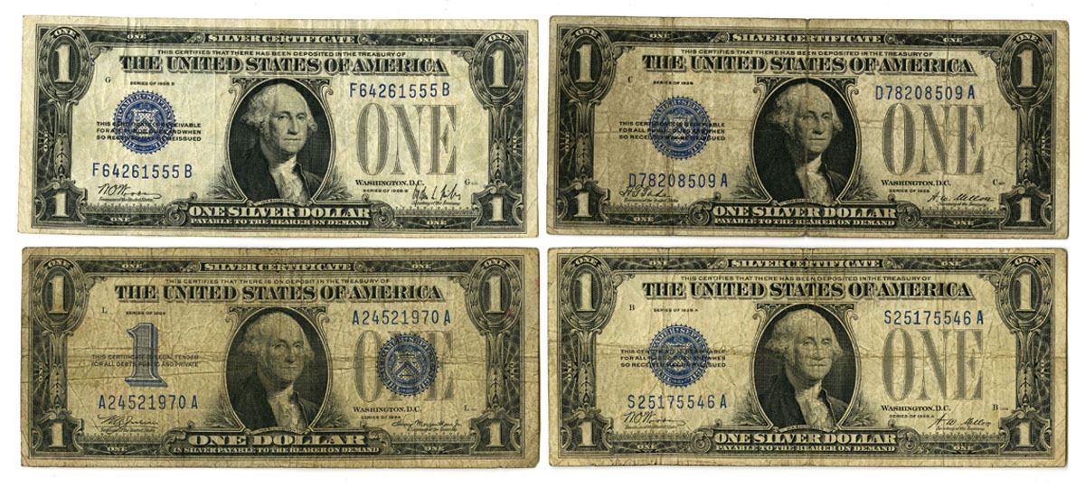 Washington D.C., 1928 to 1934. Lot of 4 $1 Silver Certificates, Includes: Series of 1928, Fr.# 1600; Series of 1928A, Fr.# 1601; Series of 1928B, Fr.# 1602; Series of 1934, Fr.# 1606, Notes range from Fine to Choice Fine condition. (4).