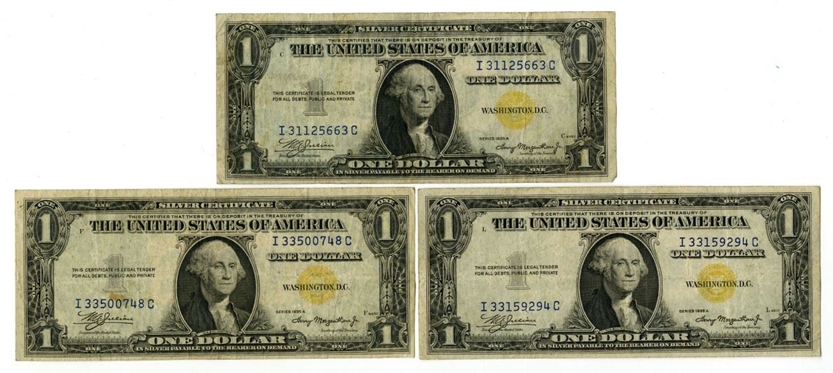 Washington D.C., Lot of 3 notes, all are Series 1935A. $1, Fr.# 2306, Issued Banknote Trio, Black print with yellow seal at right, Julian | Morgenthau Signatures, Notes range from VF to Choice VF condition. (3). Sold "AS IS" no returns accepted.