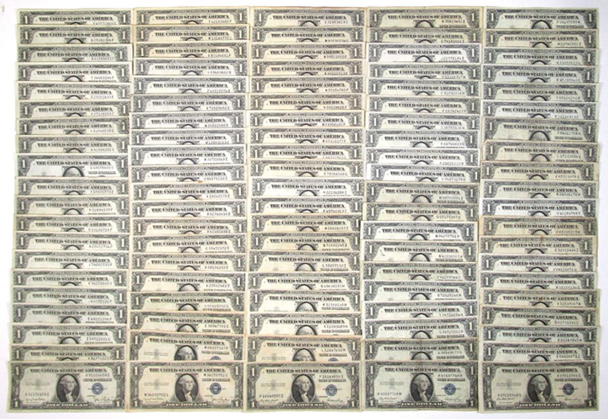 Washington D.C., 1935. Lot of 100 Banknotes, Includes: $1, P-416D2d (50), Series of 1935D, Fr.# 1613, Clarke | Snyder Signatures, Blue seal with right; $1, P-416D2e (50), Series of 1935E, Fr.# 1614, Priest | Humphrey Signatures, Blue seal at right. Notes range from Fine to XF condition. (100). Sold "AS IS" no returns accepted.