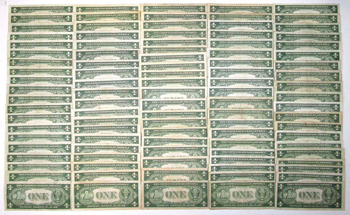 Washington D.C., 1935. Lot of 100 Banknotes, Includes: $1, P-416D2d (50), Series of 1935D, Fr.# 1613, Clarke | Snyder Signatures, Blue seal with right; $1, P-416D2e (50), Series of 1935E, Fr.# 1614, Priest | Humphrey Signatures, Blue seal at right. Notes range from Fine to XF condition. (100). Sold "AS IS" no returns accepted.