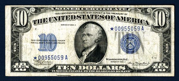 $10, 1934-A, Silver Certificate, "A nice unmolested Mid-Grade VF, Note new to census.