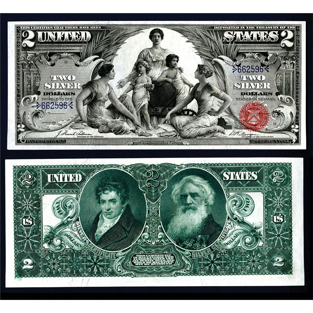 S/N 662596, pp D, Tillman | Morgan, PMG graded Choice About Uncirculated 58 EPQ, Lovely portrait of allegorical Science presenting Steam and Electricity to Commerce and Manufacture, engraved by G.F.C. Smillie and Charles Schlecht. Large margins, sharp corners and bright vibrant colors only enhance this lovely note that appears as a Choice Uncirculated note at First glance.