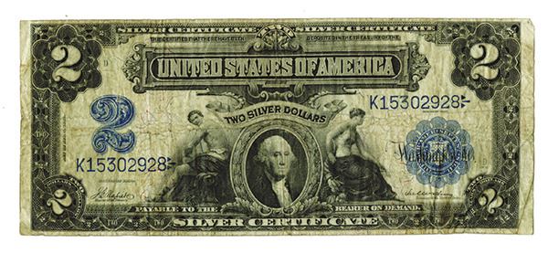 U.S. Silver Certificate, $2, Series of 1899, Fine to Choice Fine, S/N K15302928, Small blue seal.