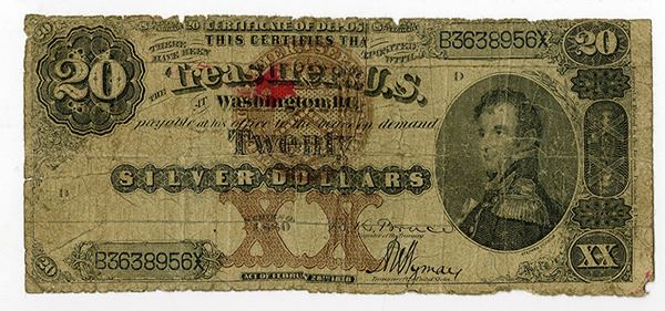 Washington, D.C., $20, Bruce | Wyman, Stephen Decatur at right, S/N B3638956, Choice VG to Fine condition with very small edge faults on the top left and lower bottom margin. BEP. Scarce note in any condition.