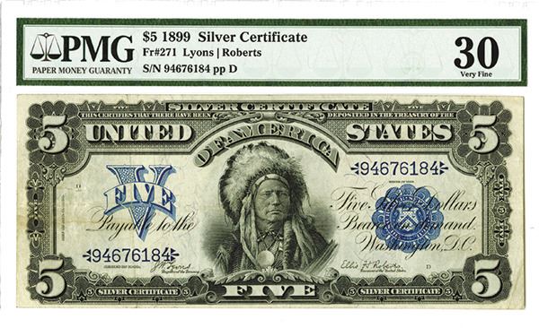U.S. Silver Certificate, $5, Series of 1899, Indian Chief, PMG Graded Very Fine 30, S/N 94676184 pp D.