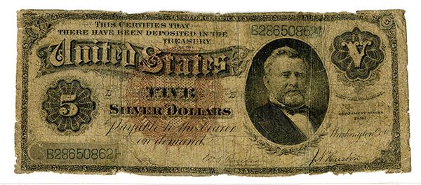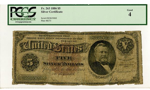 Washington, D.C., 1886, $5, Fr#263, Large Brown seal, PMG graded good 4. Significant wear but still attractive and scarce note.