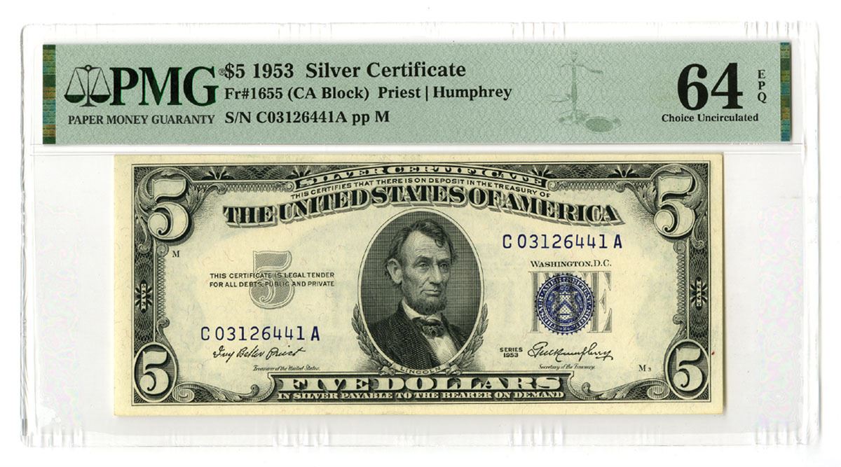 Washington D.C., 1953. $5, Series of 1953, Fr.# 1655, CA Block, Issued Silver Certificate, Blue seal at right, Priest | Humphrey signatures, S/N C03126441A pp M, PMG graded Choice Uncirculated 64 EPQ.