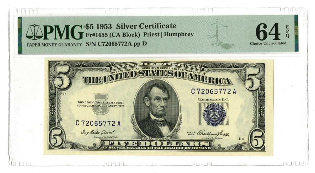 Washington D.C., 1953. $5, Series of 1953, Fr.# 1655, CA Block, Issued Silver Certificate, Blue seal at right, Priest | Humphrey signatures, S/N C72065772A pp D, PMG graded Choice Uncirculated 64 EPQ.