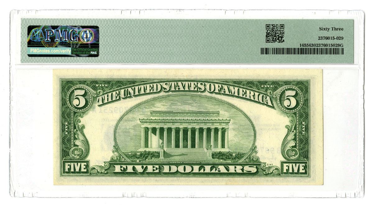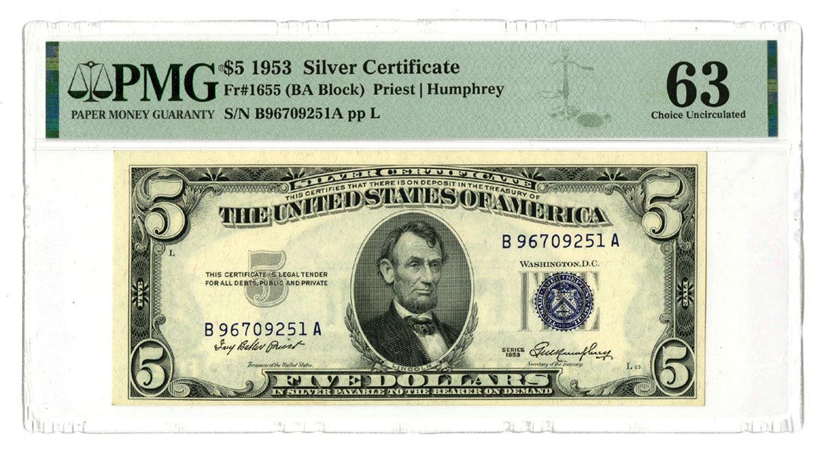 Washington D.C., 1953. $5, Series of 1953, Fr.# 1655, BA Block, Issued Silver Certificate, Blue seal at right, Priest | Humphrey signatures, S/N B96709251A pp L, PMG graded Choice Uncirculated 63.
