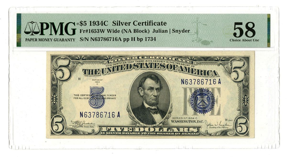 Washington, D.C., 1934. $5, Series of 1934 C, Fr#1653W Wide (MA Block), Issued Silver Certificate, Blue seal, Julian | Snyder signatures, S/N N63786716A pp H bp 1734, PMG graded Choice About Uncirculated 58.