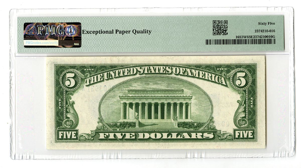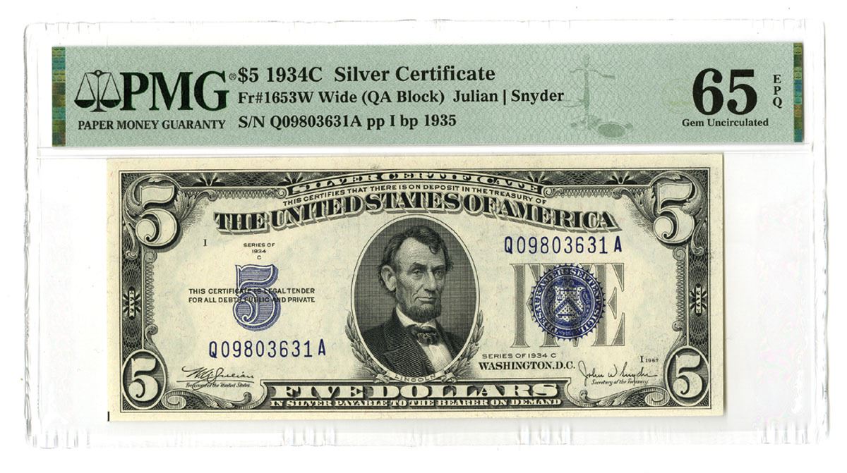 Washington, D.C., 1934. $5, Series of 1934C, Fr#1653W Wide (QA Block), Issued Silver Certificate, Blue seal at right, Julian | Snyder signatures, S/N Q09803631A pp I bp 1935, PMG graded Gem Uncirculated 65 EPQ.