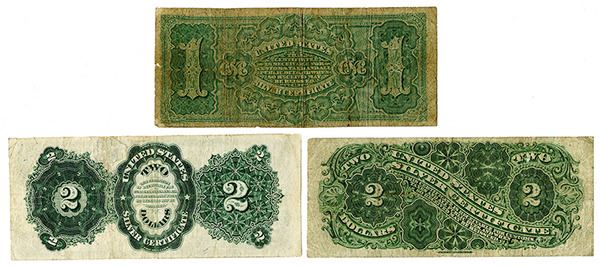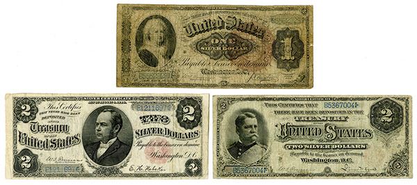 Washington, D.C., Lot of 3 notes, includes 1886, $1, Fr#219, Large brown seal, VG; 1886, $2, Fr#241, Small red seal, VF condition; and 1891, $2, Fr#245, Small Red, VF to VF+ with the red seal lightly faded, attractive trio of notes.