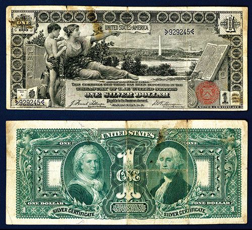 1896, $1, Silver Certificate, S/N 929245, Choice Fine with stains top middle, small splits at strong top middle and left side fold. Always popular.