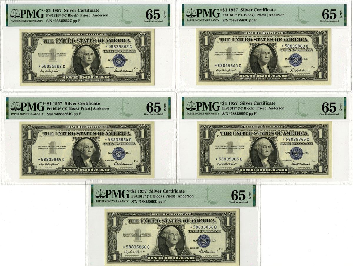 Washington, D.C., Lot of 5 Sequential, Series of 1957, $1, Silver Certificates, Fr#1619*, Priest | Andreson signatures, S/Ns *58835862 C to *58835866 C, all are PMG graded Gem Uncirculated 65 EPQ. Attractive replacement note group. BEP. (5)
