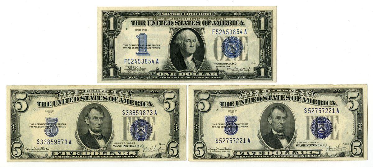 Washington D.C., 1934. Lot of 3 Issued Silver Certificates, Includes: $1, Series of 1934, Fr.# 1606, Julian | Morgenthau signatures; $5, Series of 1934D, Fr.# 1654W and Fr.# 1654N, Clarke | Snyder Signatures. Notes are in VF to XF condition. (3). Sold "AS IS" no returns accepted.