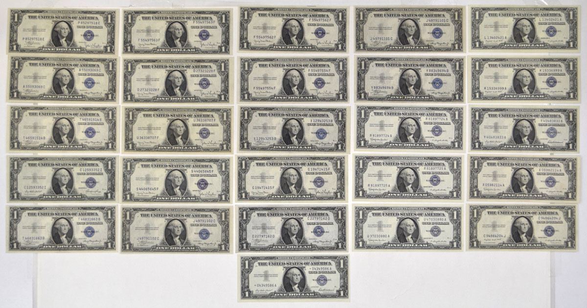 Washington D.C., 1935 to 1957. Lot of 26 Issued Silver Certificates, Includes: $1, Series 1935A, Fr.#1606 (8); $1, Series 1935C, Fr.#1612; $1, Series 1935D, Fr.#1613 (7); $1, Series 1935E, Fr.#1614; $1, Series 1935G, Fr.#1617; $1, Series 1957, Fr.#1619 (2); $1, Series 1957A, Fr.#1620 (2); $1, Series 1957B, Fr.#1621 (4). Notes are in AU to UNC condition. (26). Sold "AS IS" no returns accepted.