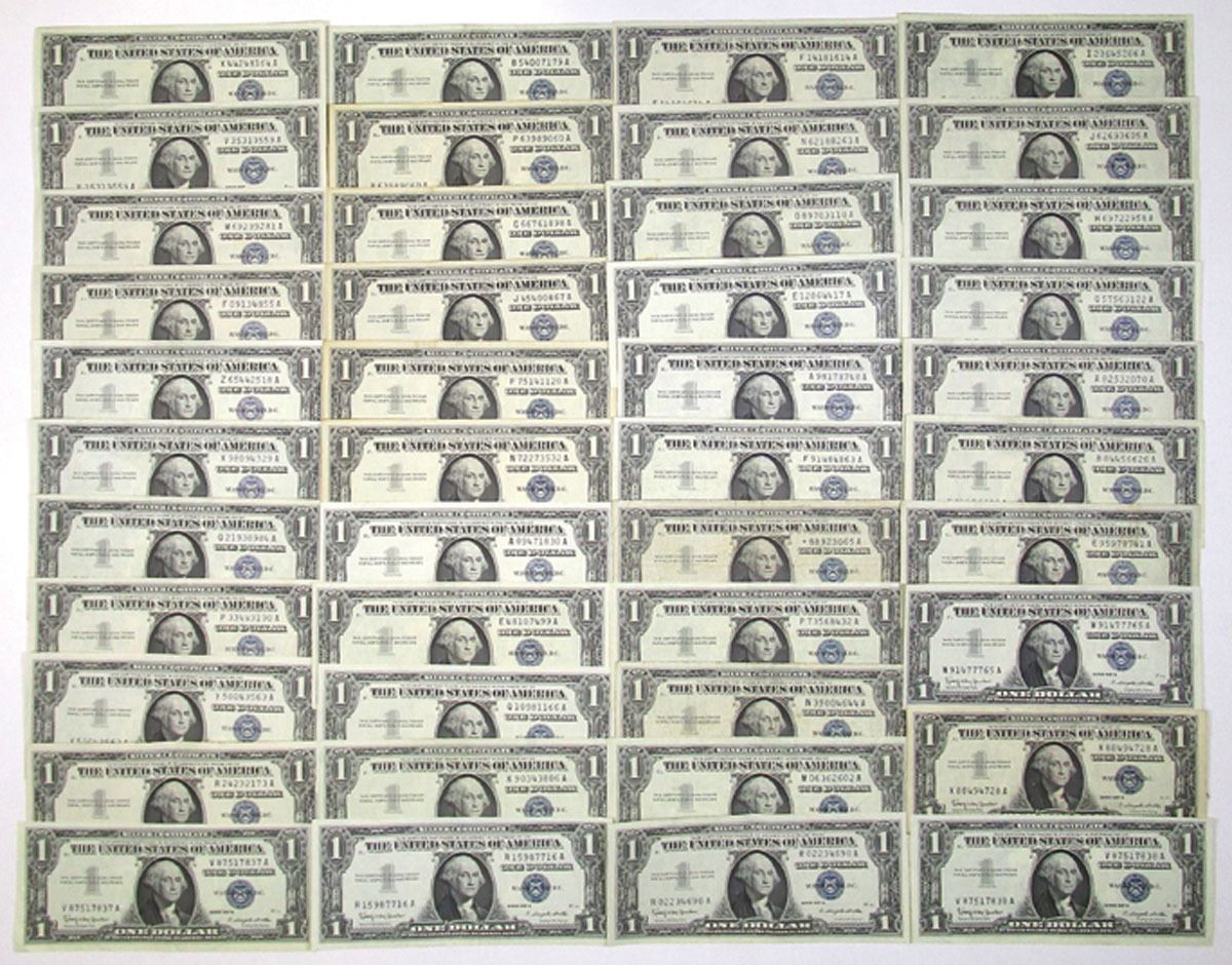 Washington D.C., 1957. Lot of 43 Issued Banknotes, Includes: $1, P-419 (11), Series of 1957, Fr.# 1619, Priest | Anderson Signatures; $1, P-419a (26), Series of 1957A, Fr.# 1620, Smith | Dillon Signatures; $1, P-419b (6), Series of 1957b, Fr.# 1621, Granahan | Dillon Signatures. All have blue seal at right. Notes range from Fine to AU condition. (43). Sold "AS IS" no returns accepted.