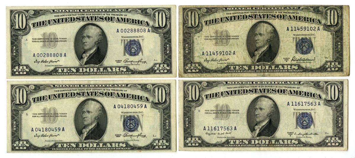 Washington D.C., 1953. Lot of 4 Issued Silver Certificates, Includes: $10, Series 1953, Fr.# 1706 (2); $10, Series 1953A, Fr.# 1707; $10, Series 1953B, Fr.# 1708. Notes range from Fine to XF condition. (4).