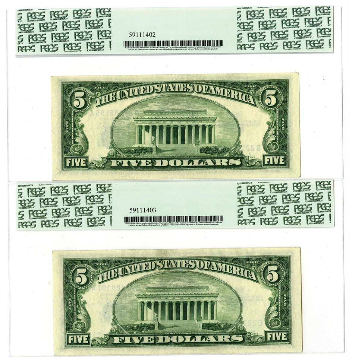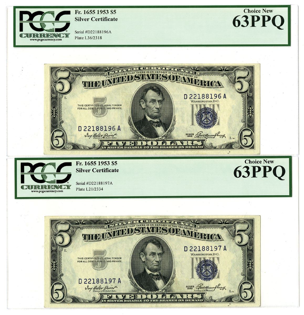 Washington D.C., Lot of 2 notes, both are Series 1953. $5, P-417, Fr.1655, Sequential Issued Banknote Pair, Julian | Humphrey Signatures, Small blue seals at right, S/Ns D22188196A pp L36/2318 and D22188197A pp L21/2334, Both are Legacy graded Choice New 63PPQ. (2). Sold "AS IS" no returns accepted.