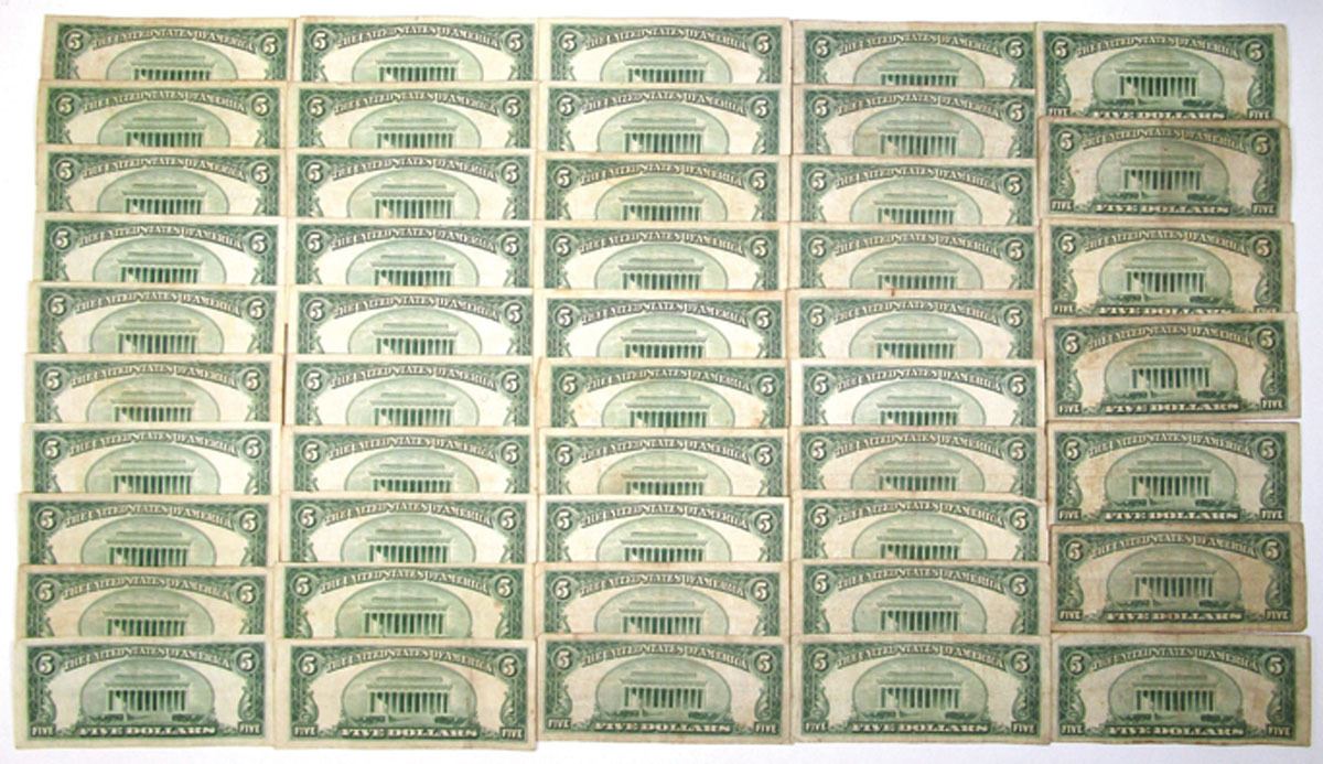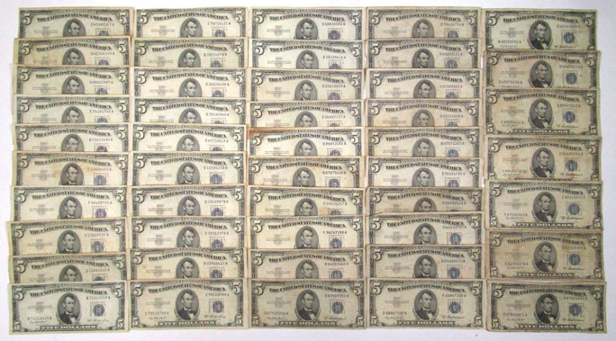 Washington, D.C., 1953. Lot of 47 Silver Certificates, Includes: $5, Series 1953, Fr.# 1655 (19), Blue seals, Priest | Humphrey signatures; $5, Series 1953A, Fr.# 1656 (28), Blue seals, Priest | Anderson signatures. Notes range from Fine to VF condition. (47).