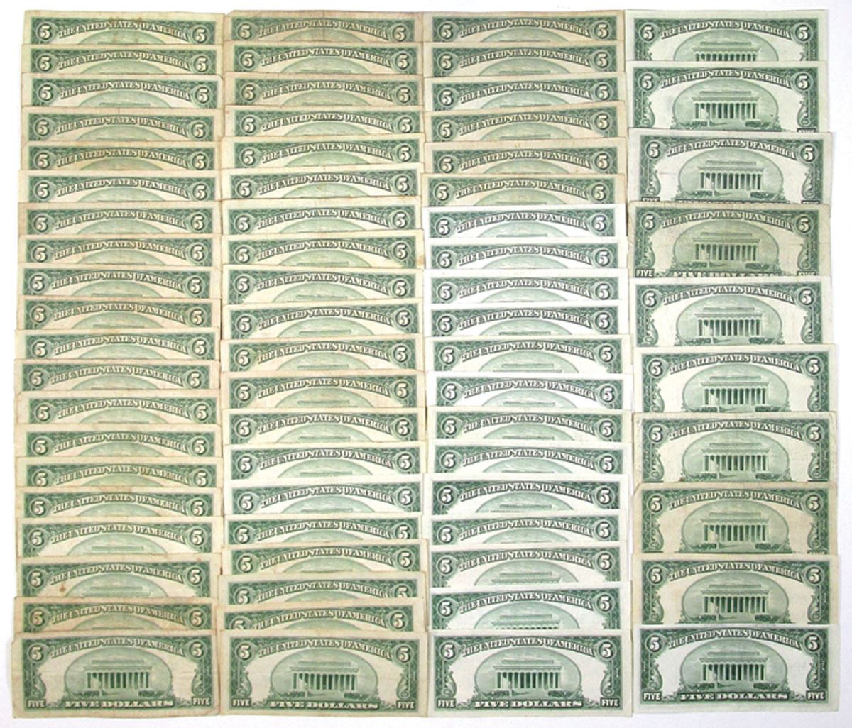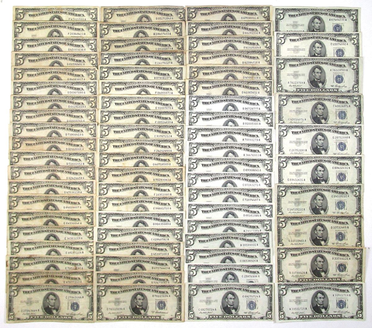 Washington, D.C., 1953. Lot of 69 Silver Certificates, Includes: $5, Series 1953, Fr.# 1655 (29), Blue seals, Priest | Humphrey signatures; $5, Series 1953A, Fr.# 1656 (40), Blue seals, Priest | Anderson signatures. Notes range from Good to Choice VF condition. (69).