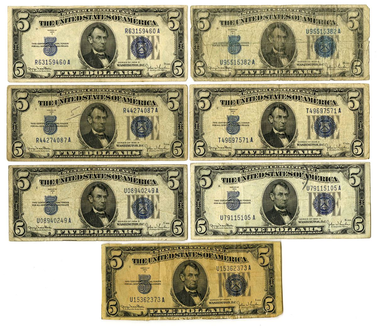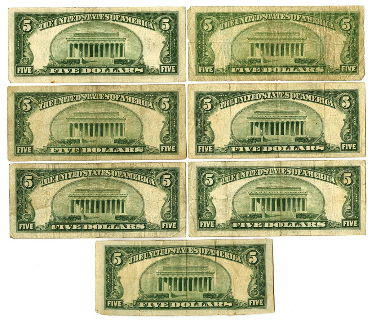 Washington D.C., 1934. $5, Series of 1934D, Fr.# 1654W (4) and Fr.# 1654N (3), Issued Group of Banknotes, Blue seals at right, Clark | Snyder signatures, Notes range from Good with tape and small faults to Fine+ condition. (7).
