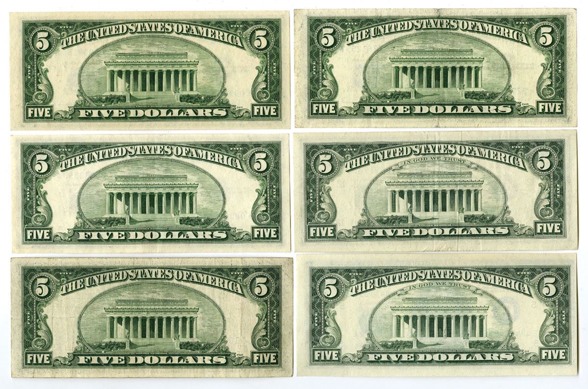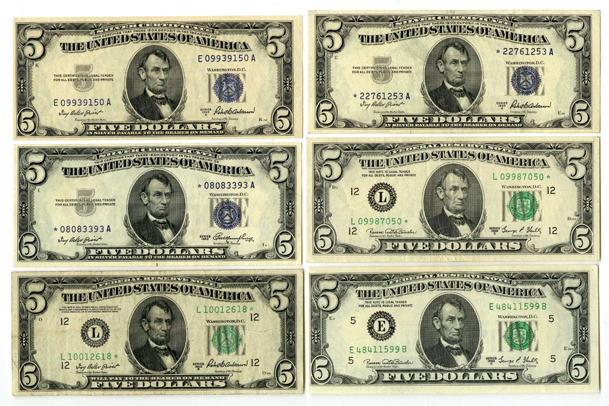 Various States, 1950 to 1969. Lot of 6 Issued Silver Certificates and Federal Reserve Notes, Includes: $5 Silver Certificate Star Note, Series 1953, Fr.# 1655*; $5 Silver Certificate, Series 1953A, Fr.# 1656; $5 Silver Certificate, Series 1953A, Fr.# 1656*; $5 Federal Reserve Note, Series 1950B, Fr.# 1969L*; $5 Federal Reserve Note, Series 1969C, Fr.# 1972L*; $5 Federal Reserve Note, Series 1969C, Fr.# 1972E. Notes range from VF to AU condition. (6).
