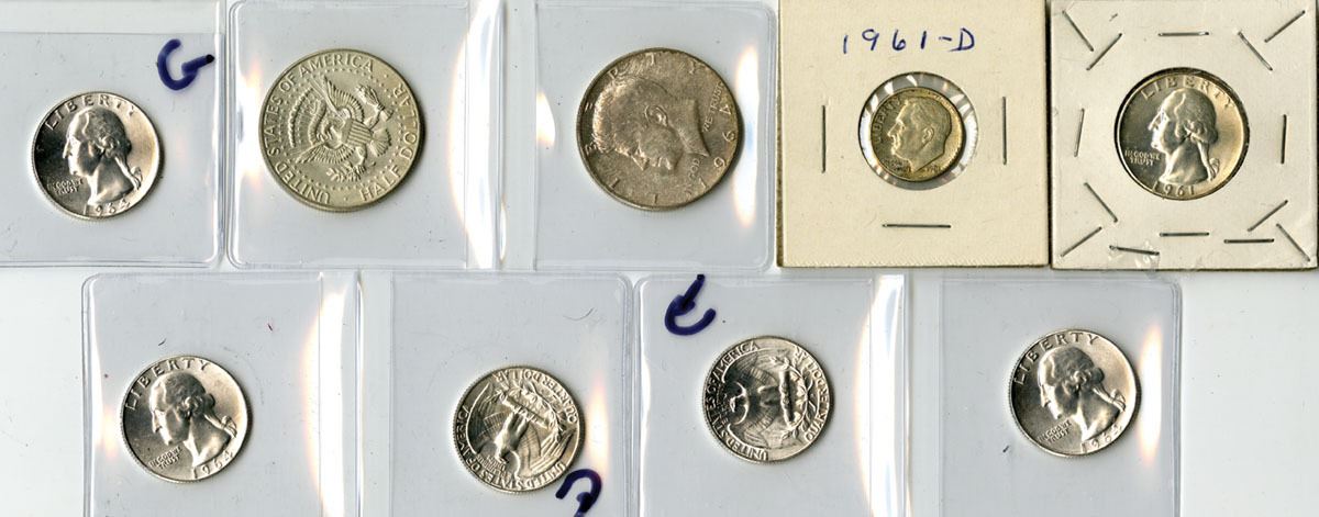 U.S., 1961-64. Lot of 9 Choice to Gem Uncirculated 90% silver coins including 1 Roosevelt Dime (1961-D), 6 Washington Quarters (1 dated 1961 and 5 dated 1964-D), and 2 Kennedy Half Dollars (1964 and 1964-D). Coins are struck in .900 fine silver. Roosevelt dime weighs 2.50 grams, Washington quarters weigh 6.25 grams each, and Kennedy half dollars weigh 12.50 grams each. Total weight for the lot is 65 grams, with an actual silver weight (ASW) of 58.5 grams (1.88 troy oz) of .999 silver. Some of the coins have wonderful toning. $2.60 Face Value of 90% Silver. (9). Sold “AS IS” no returns accepted.
