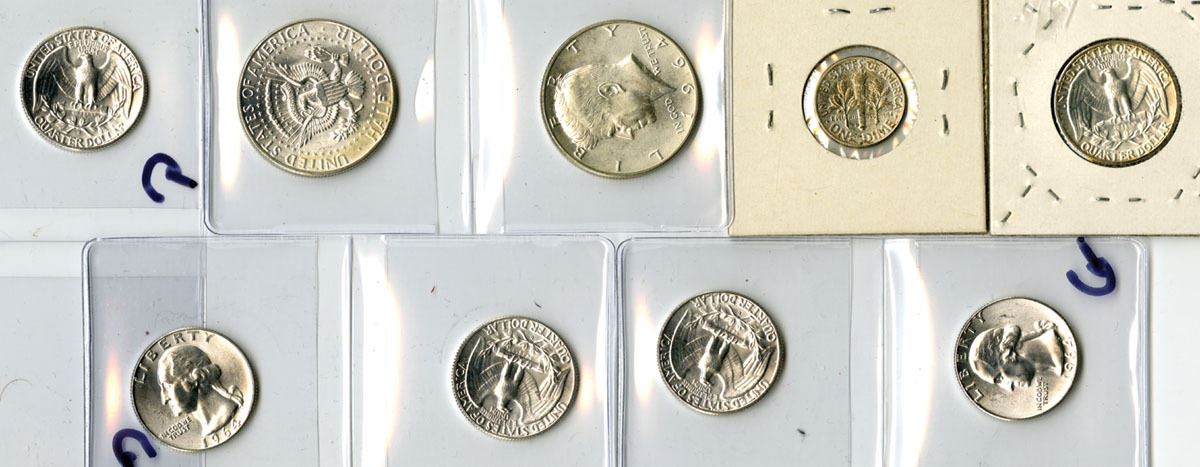 U.S., 1961-64. Lot of 9 Choice to Gem Uncirculated 90% silver coins including 1 Roosevelt Dime (1961-D), 6 Washington Quarters (1 dated 1961 and 5 dated 1964-D), and 2 Kennedy Half Dollars (1964 and 1964-D). Coins are struck in .900 fine silver. Roosevelt dime weighs 2.50 grams, Washington quarters weigh 6.25 grams each, and Kennedy half dollars weigh 12.50 grams each. Total weight for the lot is 65 grams, with an actual silver weight (ASW) of 58.5 grams (1.88 troy oz) of .999 silver. Some of the coins have wonderful toning. $2.60 Face Value of 90% Silver. (9). Sold “AS IS” no returns accepted.