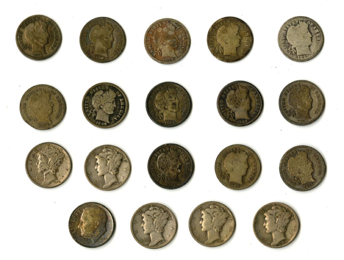 U.S., 1896-1948. Lot of 19 U.S. silver dimes including Barber, Mercury and early Roosevelt issues. Group includes Barber dimes dated 1896, 1897, 1900, 1903, 1903-O, 1906, 1908, 1911, 1912, 1914, 1914-D, 1915 and 1916; Mercury dimes dated 1940-D, 1942 (2) and 1945 (2); and one Roosevelt dime dated 1948. Coins show a range of circulation with typical wear, toning and some environmental exposure consistent with age. Each coin weighs 2.50 grams with a silver fineness of .900, giving a total weight of 47.50 grams for the lot and an actual silver weight (ASW) of 42.75 grams (1.374 troy oz) with a Face Value of $1.90. (19). Sold “AS IS” no returns accepted.