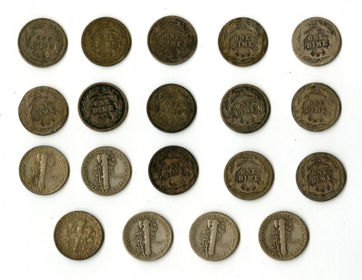 U.S., 1896-1948. Lot of 19 U.S. silver dimes including Barber, Mercury and early Roosevelt issues. Group includes Barber dimes dated 1896, 1897, 1900, 1903, 1903-O, 1906, 1908, 1911, 1912, 1914, 1914-D, 1915 and 1916; Mercury dimes dated 1940-D, 1942 (2) and 1945 (2); and one Roosevelt dime dated 1948. Coins show a range of circulation with typical wear, toning and some environmental exposure consistent with age. Each coin weighs 2.50 grams with a silver fineness of .900, giving a total weight of 47.50 grams for the lot and an actual silver weight (ASW) of 42.75 grams (1.374 troy oz) with a Face Value of $1.90. (19). Sold “AS IS” no returns accepted.