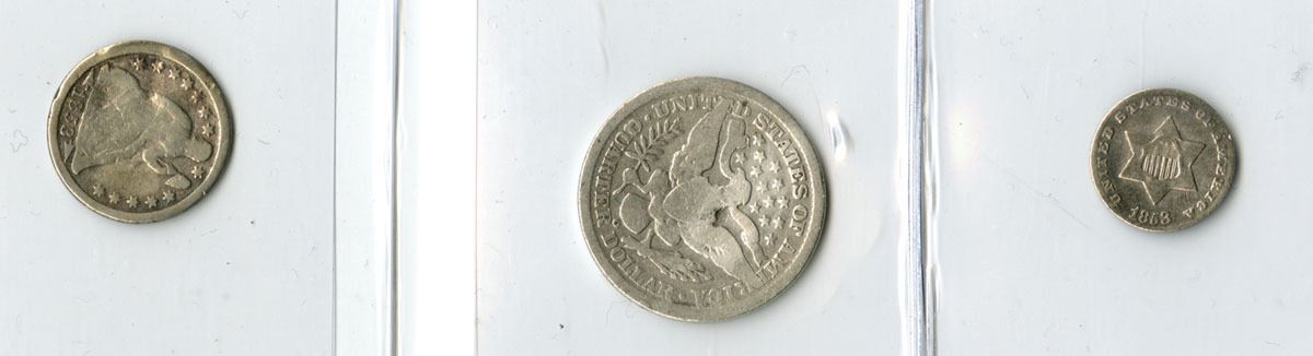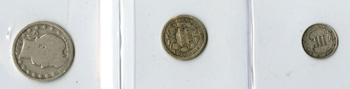 U.S., 1853-98. Lot of 3 silver coins including an 1853 Seated Liberty Dime (Philadelphia), an 1899-O Barber Quarter Dollar from the New Orleans Mint, and an 1853 Three Cent Silver (Trime). Three Cent Silver coin weighs 0.80 grams with a silver fineness of .750, Seated Liberty Dime weighs 2.49 grams with a silver fineness of .900, and the Barber Quarter Dollar weighs 6.25 grams with a silver fineness of .900. Total weight for the lot is approximately 9.54 grams. Total actual silver weight (ASW) for the lot is approximately 8.61 grams (0.277 troy oz) of silver. (3). Sold “AS IS” no returns accepted.