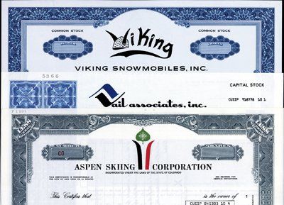 CA.1960's-90's. 5 different specimen stock certificates. Companies include: 1). Vail Associates. Famous ski resort company; 2). Aspen Skiing Corp. Famous Aspen Mountain Skiing company; 3). Viking Snowmobiles, Inc.; 4). Morrow Snowboards, Inc.; 5). American Skiing Co. Family on skis. All are well known and scarce skiing and snow related companies. Various printers. Cool assortment.