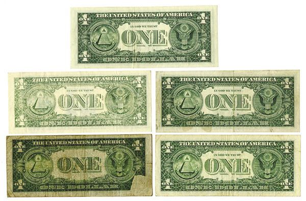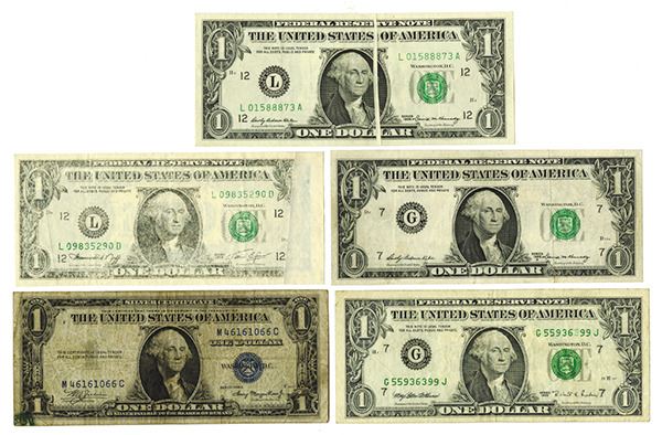 Washington, D.C., Lot of 5 notes, Includes $1, Series 1969A, Missing Serial Number Error, Crisp Choice VF to XF; $1, Series 1969, Vertical Gutter pre printing fold error, XF; $1, Series 1935 A, Misprinted on lower left front and lower right back, Fine; $1, Series 1974, Insufficient Inking and obstructed printing double error, the right 1/2 inch of the note was not printed and the note front and back looks like insufficient ink, but please examine; and $1, 1995, "Stuck Digit" numeral #3 is very faint.