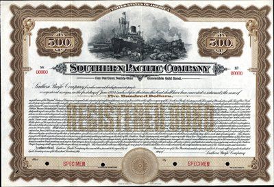 1914. $500. Specimen Registered, 5%, 20 Year Convertible Gold Bond. Brown border in horizontal format. Steamship and train at dock. XF condition. Red specimen overprints, POC's and "00000" serial numbers. No coupons attached. Rare certificate. ABNC.